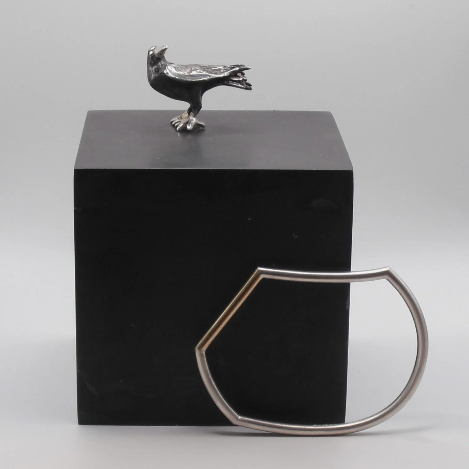 Silver Raven on Blue Lias stone plinth and corner bangle in silver and brass.